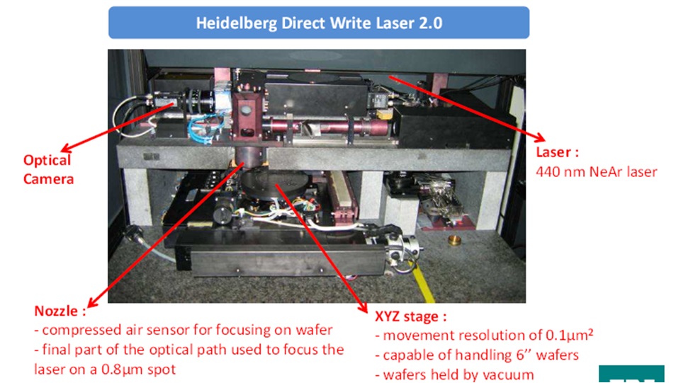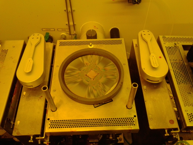So, we take the wafer, place it on the coating machine and drop a droplet of photoresist on it. The machine will spin the wafer to 3500 rpm and centrifugal force will spread the resist uniformly all over the wafer. Wait some time for the resist to stiffen at the 80°C. The photo below which shows the coated sample is a bit yellowish because the room is illuminated by UV-free light source. Once the wafer is coated, we use laser to illuminate parts of the resist that we want to remove. How the laser knows which parts to illuminate and which not? We control it with computer program and the program reads CAD file that we have prepared before. This process, called photolithography, is more often done with the UV lamp and photo mask, but masks for such small and sensitive structures are enormously expensive, especially for the research samples where the layout is constantly changing. After laser exposition, the film is developed – which means it is washed in some basic or even acidic solution to remove the parts of the resist “destroyed” by the laser. Developement process is performed in similar manner as deposition: you make everything spin at the high rate, drop a bit of developer solution and wait some time for reaction to complete, all at the cca 113°C.