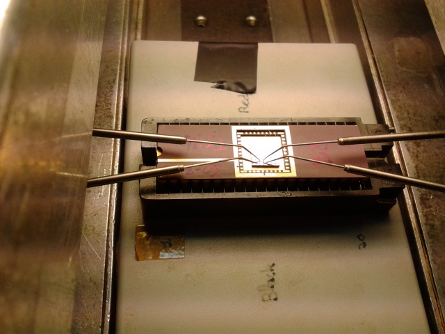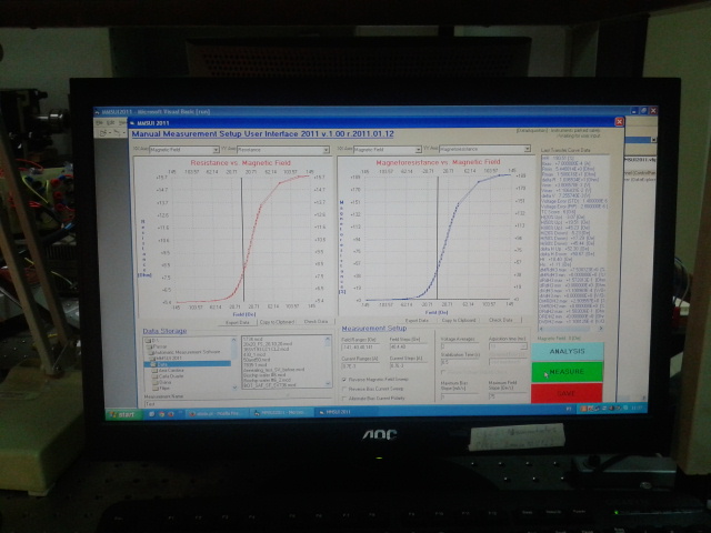 Here we see a typical 4-probe test set-up. The sensor is placed inside the alternating homogeneous magnetic field (within a Helmholtz coil). Voltage of 5 mV is applied on the sample and resistance is calculated automatically, by help of the computer program. In the end, we get a nice transfer function which describes dependence of the electrical resistance on the magnetic field, which is the main characteristic of the magnetoresistive sensor. Nominal value of the resistor was around 65 Ω, with magnetoresistance ratio of 6% and linear range from -20 to 0 Oersted. More details about how the sensor works and physical principles of magnetoresistance I’ll try to cover in the next post.