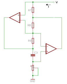 Did you notice how the current is negative when the voltage is positive on Chua’s diode? And vice versa? It doesn’t seem as usual. And it’s not. This is the reason why the component is said to have a negative resistance. I’ll let you philosophize on what it means. Just imagine, you are pushing current in one direction, but it comes way back to you. The engineers have come up with the circuit that models negative resistor using operational amplifiers, and on the image below is how it looks like. However, one negative resistor gives us one slope of Chua’s diode function, and we need two. What do we do now? We push the amplifier in the saturation. We put the gain so high that for the voltages above E and lower that -E output is alway +Vs or -Vs (power supply voltages). Then, at the same time, we add another negative resistor in parallel so that it defines the slope in the regions where the first one is saturated. By trimming the component values, we get the desired transfer function of Chua’s diode.