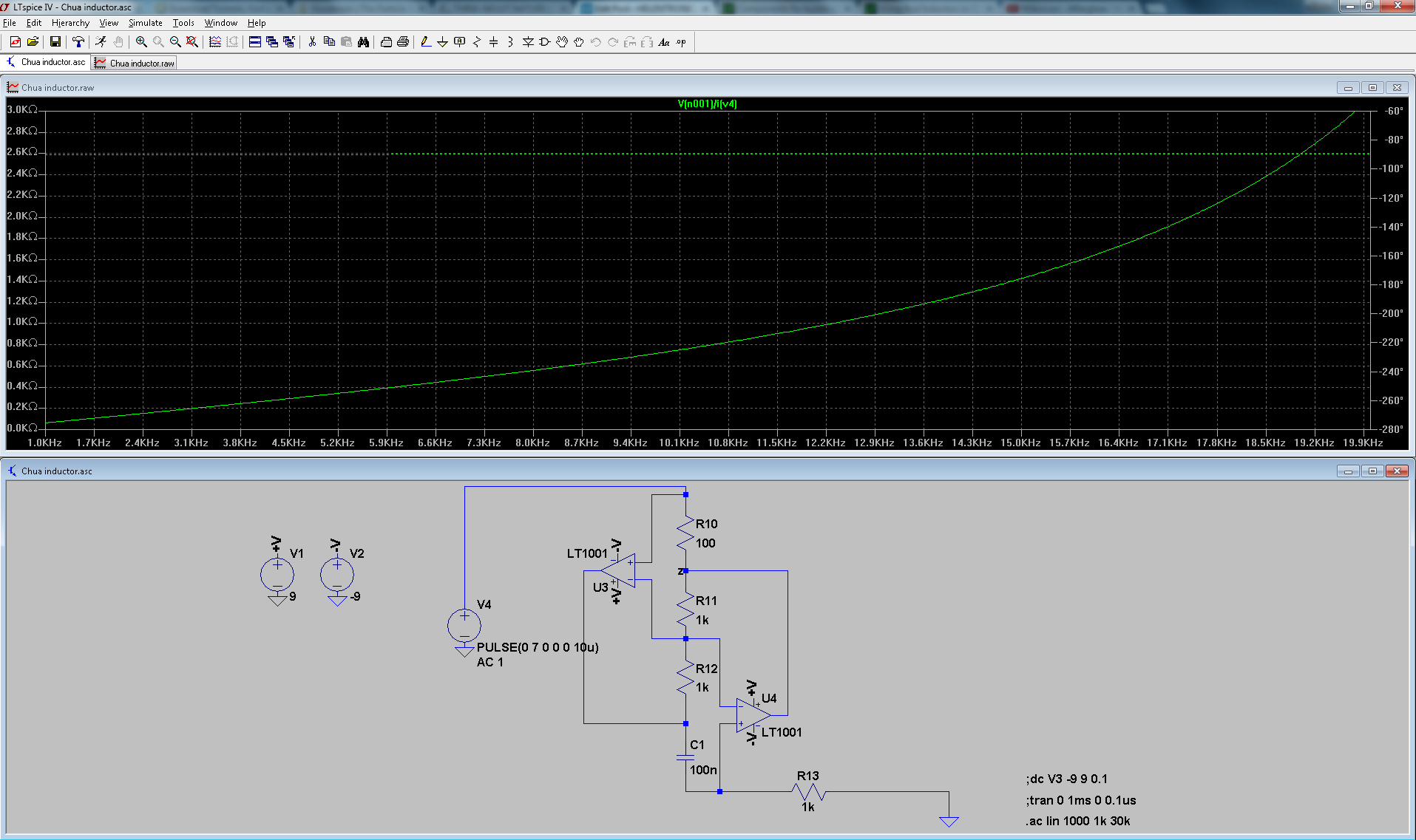 Gyrator, or the “fifth linear element”, is a very handy circuit that enables us to build idealized versions of components such as inductors, transformers or capacitors. Yes, you read it well – we’ll use a bunch of op amps, resistors and capacitors to build a simple coil inductor. Basic inductance-simulating gyrator circuit is here, while more advanced one, the one we’ll use in this project is in the image on the right. I tried to do the math for the impedance expression, but very soon I got really messy and decided to rather make a simulation in LTspice. Results can be seen below.