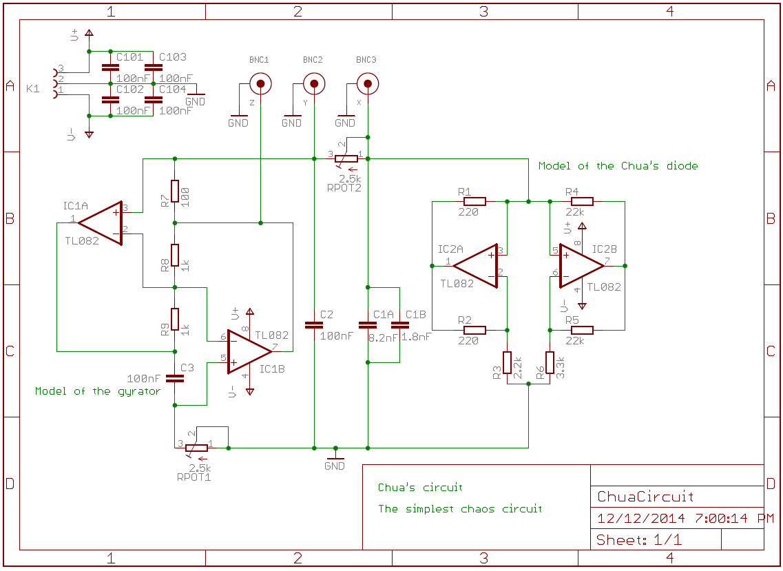 To quote wikipedia, Chua’s circuit “is a simple electronic circuit that exhibits classic chaos theory behavior. This means roughly that it is a nonperiodic oscillator; it produces an oscillating waveform that, unlike an ordinary electronic oscillator, never repeats”. Very insightful design guide is given on its “official” website. Basic circuit looks somewhat like this: