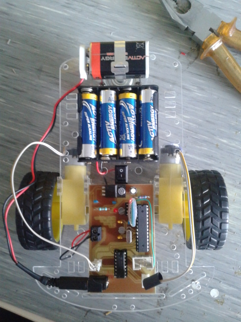 The motors are driven by the H-bridge, embedded in the L293D IC. H-bridge means that I can drive the motor in two ways, back and forward, by changing the direction of the current through it. L293 is very handy for this application cause it contains an amazing amount of 2 bridges, i.e. two motors can be controlled. Usually when you drive motors or some other inductive load, you would do it using transistor switch and diode across the motor to prevent overvoltage damage. L293D has the diodes internally embedded so there was no need for additional components (but be careful, L293-with-no-D, has no diodes and may cause destruction if you don’t put them). The L293 is simply controlled by the Atmega via its PWM enabled digital outputs.