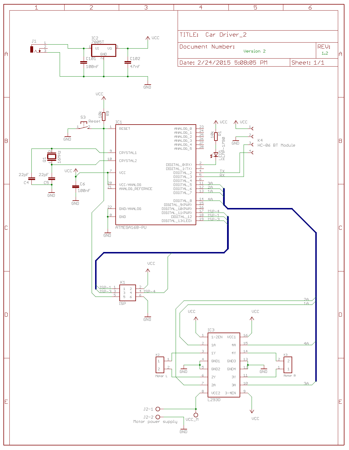 Control circuit is given in the schematic on the left. It is powered by 9V alkaline battery and voltage-regulated with 7805. The center piece is, of course, Atmega168 along with its 16 MHz quartz. But the most sophisticated piece of electronics is this pretty Bluetooth module HC-06, also fetched from E-bay. It only speaks universal serial, and luckily again, Atmega168 has no problems with it.