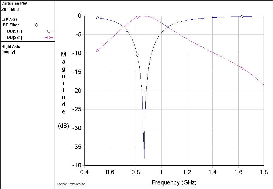There we go. According to the simulation the output is not bad: center frequency is a bit off but return loss (reflection) in the pass band is less than -35 dB. Bandwidth is also a bit wide, but that’s expected from a 1st order filter.