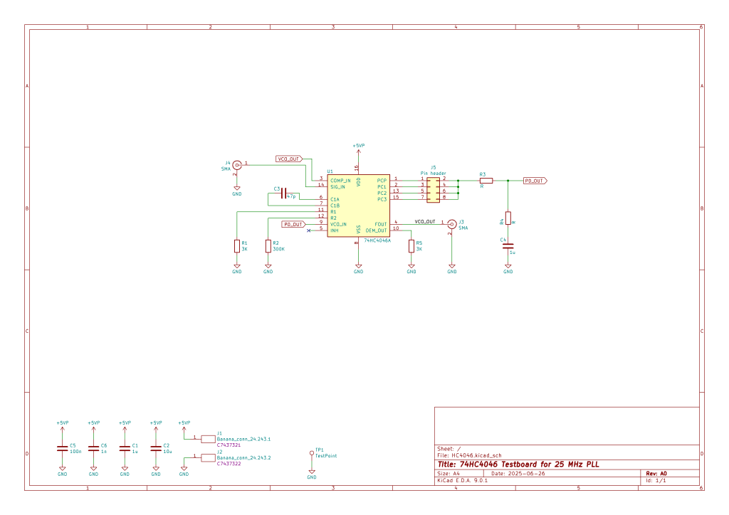 The 4046 is an ancient chip with an integrated VCO and a couple of phase detectors. According to the datasheet, and application notes, it could be usable at 25 MHz, but the Internet is very skeptical about that. Apparently this chip doesn’t perform well at frequencies beyond a couple of MHz, it requires a cumbersome filter tuning and behaves very unreliably, depending on temperature, supply and configuration. People over at TI E2E forums are frustrated by the lack of documentation on working examples and configuration guidelines. There has been an intense discussion over at EEVBlog’s forum about it, as well.