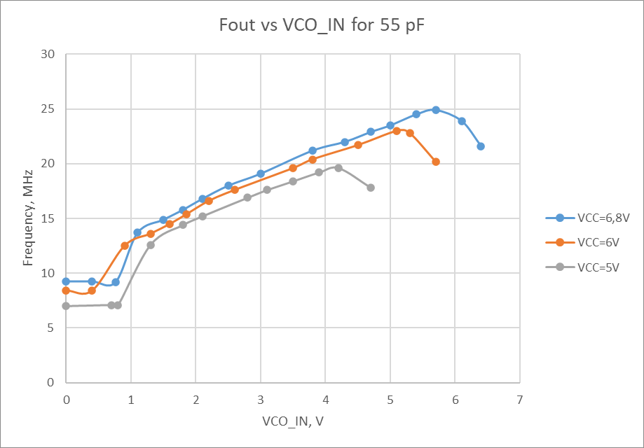 When C1 is 40 pF, we see a nice linearity but at relatively modest range, from 15 to 26 MHz. This was all at 6.8V supply. Lower voltages couldn’t reach the desired 25 MHz. This is much different then what can be found in the datasheet (Figure 19, where the same values for R1 and C1 are taken). My setup definitely couldn’t reach the 30 MHz, and it makes me curious how they got such a nice linearity in that area.