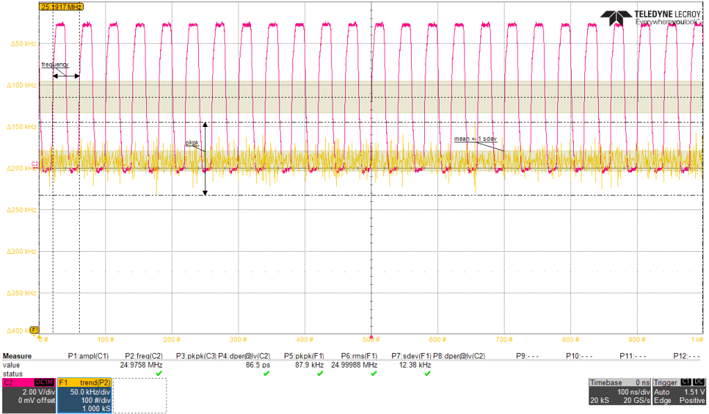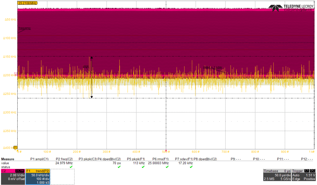 Here is some frequency stability analysis I did over the various time durations. During the 1 us, there was standard deviation of 12.4 kHz with peak 44 kHz deviation. During the 50 us, there was deviation of 17.2 kHz with peak 56 kHz deviation. During the 2 ms, there was deviation of 67.7 kHz with peak 211 kHz deviation