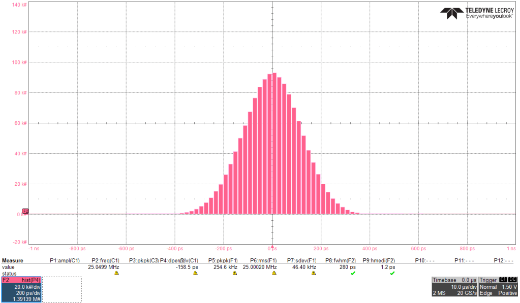 Usually, for jitter measurements are better suited histogram distributions. Below we can see that median jitter of my Agilent signal source is 1.2 ps with FWHM spread of 280 ps. The locked 4046 has median jitter of only 7 fs (!) with the spread of 101 ps. Does this suggest a hard-to-believe fact that my pretty rudimental PLL has better performance at 25 MHz than the industry standard metrology equipment?