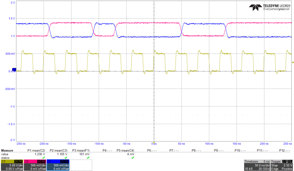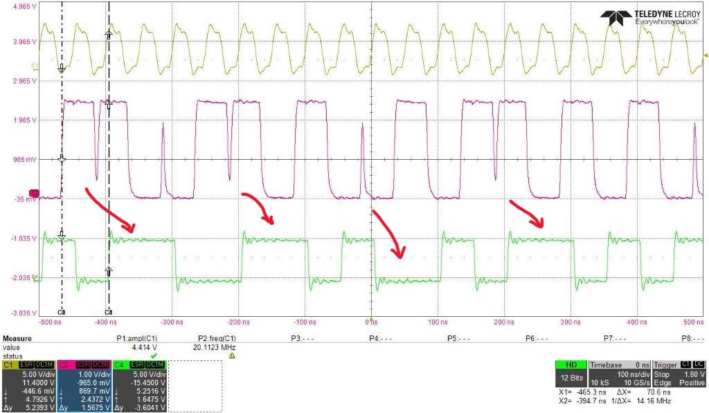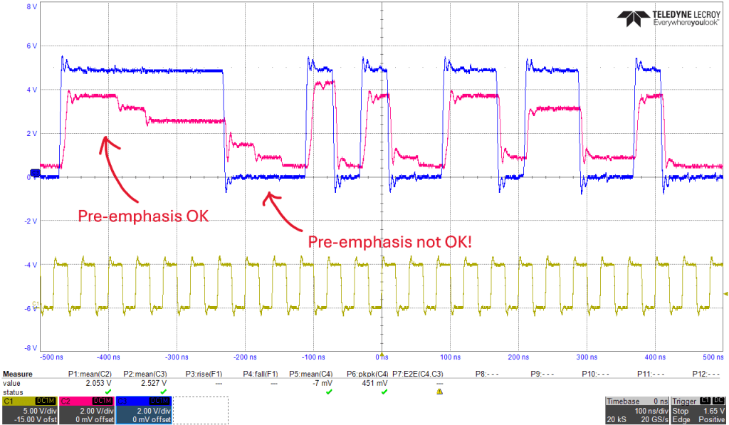 I was not so lucky with my pre-emphasis circuit, though. The circuit does its job well, be XOR-ing delayed signal with the original and summing up all the taps, but there was a certain timing issue. First, I noticed the pre-emphasis boosts at the wrong time – instead at the transitions, they appeared somewhere in the middle of the high level phase. Then I realized that my signal has double the delay time between tap 1 and the original. This felt really weird…