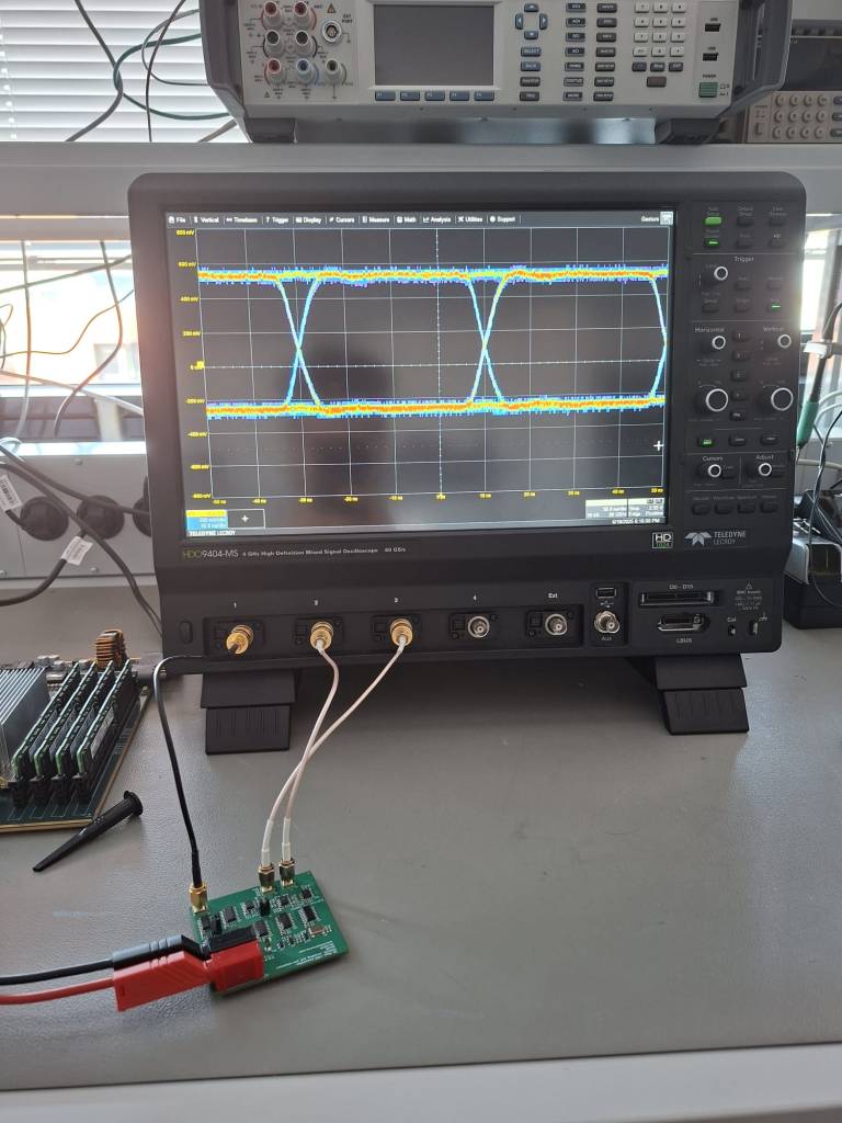 Few weeks later, I got my fully assembled prototypes. No soldering issues, no bad placement, clean silkscreen printing. JLC did a good job here. I connected 5V bench power supply and hooked up the coax cables to the 4 GHz oscilloscope, and happily established that nothing went broken, nor burned. To my delight, the PRBS generator seemed to work just fine, producing nice NRZ signal, spectrum of which corresponds to the expected one: