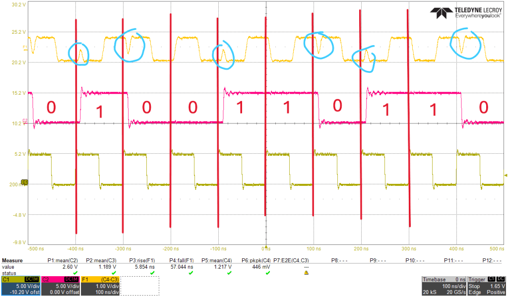 I wasn’t lucky neither with the Manchester encoding. The circuit worked as it should, creating the transitions instead of having flat lines, but there was something peculiar.